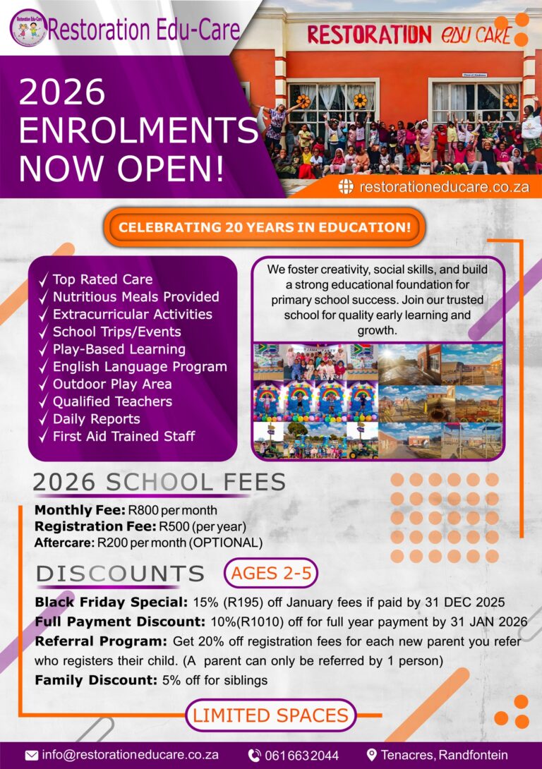 Welcome to Restoration Edu-Care, where learning is made fun through play! Located in Tenacres, Randfontein, we are a well-established early childhood education center serving children aged 2 to 6. For over 10 years, we’ve proudly nurtured young minds, focusing on creativity, social skills, and a strong educational foundation to prepare each child for a successful primary school journey. Many of our graduates go on to excel both academically and socially—a testament to the quality care and learning environment we provide.
